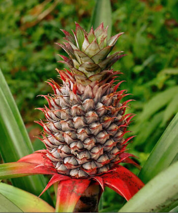 The pineapple (Ananas comosus) is a tropical, perennial herbaceous plant known for its spiky, diamond-patterned exterior, yellow fibrous flesh, and green, crown-like leaves. Originating in South America, the fruit is formed by the fusion of multiple small berries and is known for its sweet-tart flavor.